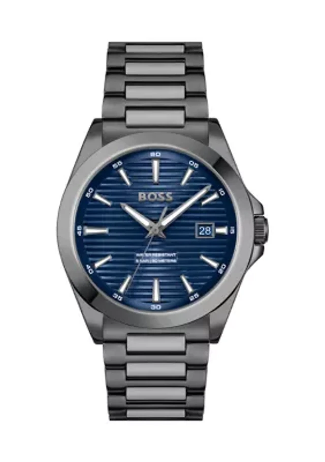 Lab Created Men's .36 TCW Genuine Hematite and Sapphire Platinum-plated Sterling Silver Ring