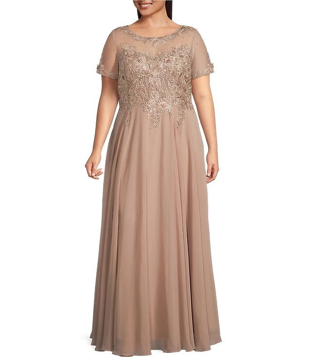Pisarro Nights Plus Size Beaded Sequin Boat Neck Illusion 3/4 Sleeve Gown