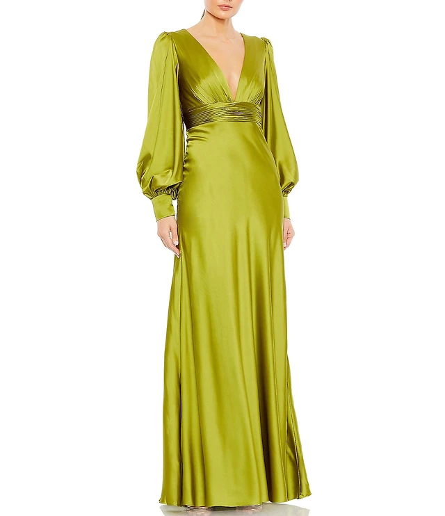 Mac Duggal Charmeuse V-Neck Long Bishop Sleeve Gown