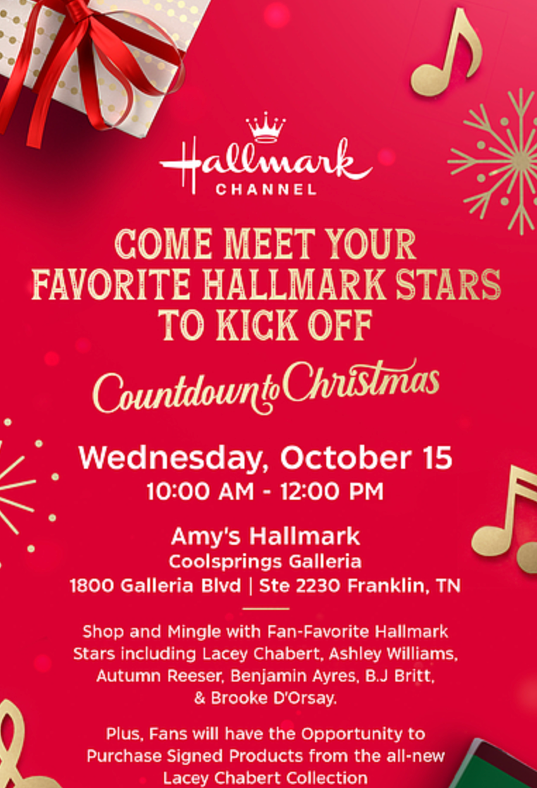 Come meet your favorite Hallmark Channel stars to kickoff Countdown to Christmas.